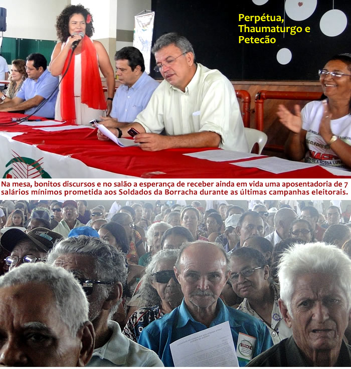 Em meio a discursos inflamados de Perpétua Almeida (PC do B), Taumaturgo Lima (PT) e Eduardo Farias (PC do B), que se orgulham de fazer parte da base de sustentação do governo Dilma, que negou o direito de décimo terceiro aos Soldados da Borracha, a voz de coerência foi do senador Sérgio Petecão (PSD), que disse que não estaria no evento para vender a ilusão que a proposta seria aprovada e colocada em prática.