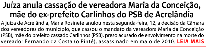 A juíza de Acrelândia, Maria Rosinete anulou nesta segunda-feira, 12, a decisão da Câmara dos vereadores do município, que cassou o mandato da vereadora Maria da Conceição (PSB), mãe do prefeito cassado Carlinhos (PSB), preso acusado de envolvimento na morte do vereador Fernando da Costa (o Pinté), assassinado em maio de 2010.
