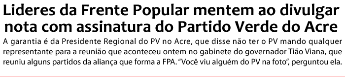 A alta cúpula da Frente Popular do Acre mentiu, ao divulgar a informação de que o Partido Verde – PV assinou a nota em que os partidos da Frente Popular do Acre concordavam com a decisão de candidatura única a prefeitura de Rio Branco. A garantia é da Presidente Regional do PV no Acre, que disse não ter o PV mando qualquer representante para a reunião que aconteceu ontem no gabinete do governador Tião Viana, que reuniu alguns partidos da aliança que forma a FPA. “Você viu alguém do PV na foto”, perguntou ela.