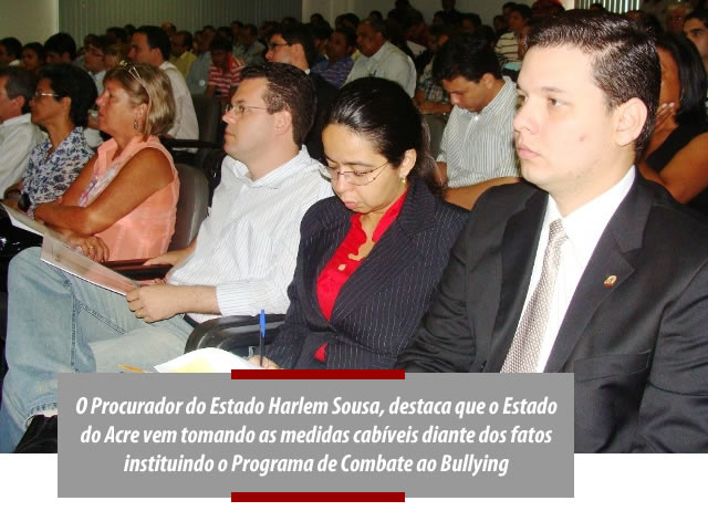 Com base na própria lei, editada pela Assembleia Legislativa, a Procuradoria-Geral do Estado do Acre, por meio do Procurador do Estado Harlem Sousa, destaca que o Estado do Acre vem tomando as medidas cabíveis diante dos fatos instituindo o Programa de Combate ao Bullying. Segundo a referida lei, caberá a cada unidade escolar criar uma equipe, com a participação de professores, alunos, pais e voluntários, para informar, orientar e prevenir esse tipo de violência. “A sociedade não aceita mais esse tipo de assédio moral. Antigamente era comum ouvir piada envolvendo questões raciais. Hoje isso é totalmente repudiado. Igualmente, o bullying, que era tido somente como ‘brincadeira de mau gosto’, agora é tratado com seriedade, pois as crianças submetidas a essa opressão têm o seu desenvolvimento social e intelectual prejudicado”, ressalta.