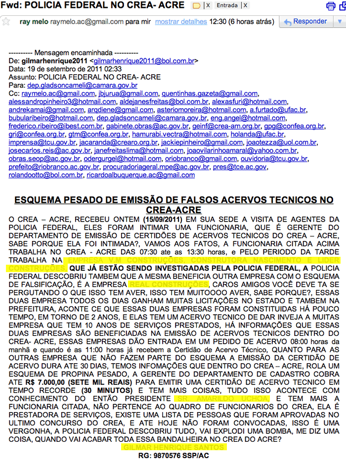Durante o fim de semana, um email recheado de supostas denúncias contra o Conselho Regional de Engenharia, Arquitetura e Agronomia do Estado do Acre (CREA-AC) foi enviado para as redações de vários órgãos de comunicação.