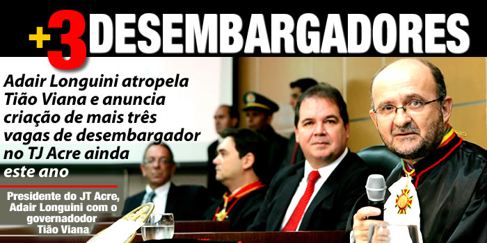 Durante o anuncio da escolha do nome do procurador de Justiça, Roberto Barros, como o novo desembargador do Tribunal de Justiça do Acre (TJ-AC), o presidente do Tribunal de Justiça do Acre, Adair Longuni, atropelou o comunicado que seria feito pelo governador Tião Viana (PT), e antecipou que seriam criadas mais três vagas de desembargador, até o início do próximo ano.