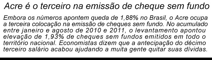 De acordo com dados apontados pelo Serasa Experian de Cheque Sem Fundo, o percentual registrou queda de 1,88%. O Acre ocupa o terceiro lugar no ranking de emissão de cheques sem fundo. O número aumentou de julho para agosto de 7,79% para 8,10%.