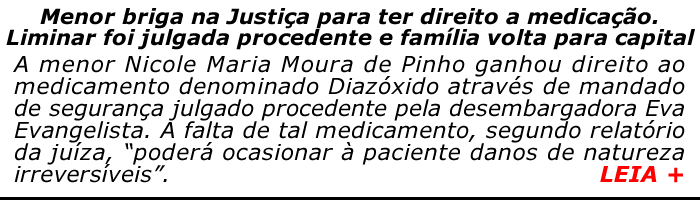 A menor Nicole Maria Moura de Pinho ganhou direito ao medicamento denominado Diazóxido através de mandado de segurança julgado procedente pela desembargadora Eva Evangelista. A falta de tal medicamento, segundo relatório da juíza, “poderá ocasionar à paciente danos de natureza irreversíveis”.