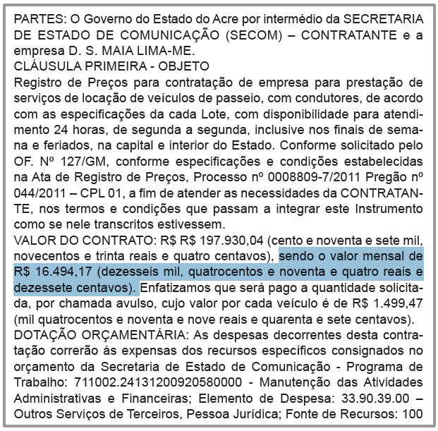 A Secretaria de Estado de Comunicação (Secom), do Governo do Acre, republicou no Diário do Estado de quinta-feira (06), pela segunda vez, o mesmo contrato no valor de R$ 197 mil para registro de preços na contratação de veículos de passeio, com condutores e atendimento 24 horas de segunda a segunda, incluindo os feriados.