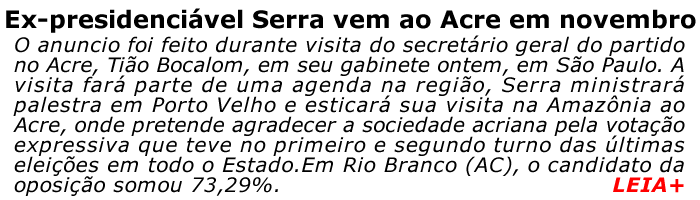 O ex-presidenciável José Serra confirmou sua vinda ao Acre em novembro. O anuncio foi feito durante visita de Tião Bocalom, secretário geral dos tucanos no Acre e o vereador Josemir Anute em seu gabinete, em São Paulo, antes da palestra ministrada para Força Sindical.