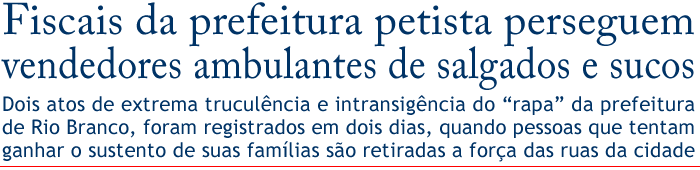 A atuação implacável dos fiscais do prefeito Raimundo Angelim (PT) tem causado verdadeiro terror nas ruas de Rio Branco. A truculência com que os fiscais, que ficaram conhecidos como o “rapa”, tratam os vendedores ambulantes de salgados e sucos, vem causando grande revolta entre as pessoas que tentam sustentar suas famílias através de atividades informais.