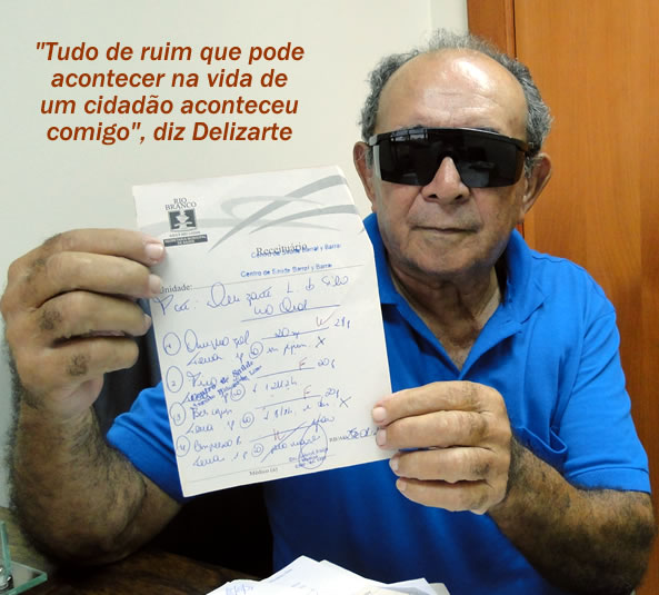 Ele afirma que precisa dos remédios por que ainda não fez o transplante de córnea e que não tem condições de comprar o systane 1,5 ml, Ibuprofeno 300 mg e o Venomaz. Ao procurar a imprensa, seu Delizarte disse que tenta sensibilizar as autoridades do Acre.