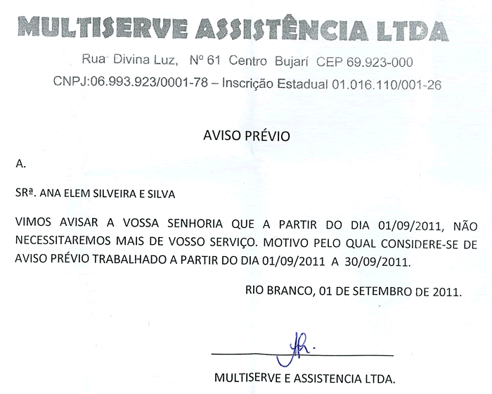 A funcionária Elem Silva após ter denunciado o prefeito Clovis Moretti, do município de Acrelândia, por contratação de Auxiliar Operacional de Serviços Diversos como técnico de enfermagem, foi obrigada a assinar aviso prévio com data retroativa. Ela acusa a empresa Multiservese de ter lhe coagido psicologicamente.