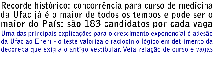O número de pretendentes a uma vaga no curso de medicina na Universidade Federal do Acre (Ufac) já é o maior de todos os tempos, na instituição. A concorrência que não passava de 50 candidatos para cada vaga ofertada saltou para 183 na seletiva de 2012.