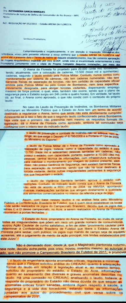 Um trecho negritado na documentação enviada ao TJ-Acre, a promotora diz que o Estado impôs sua vontade a qualquer custo sem se preocupar com a segurança dos torcedores, que corriam sérios riscos pelos abalos sofridos na estrutura do estádio.