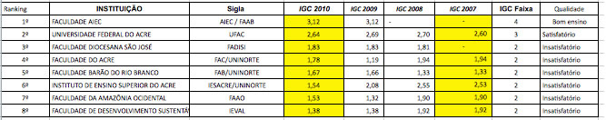 A Universidade Federal do Acre (Ufac) que durante 2007 (nota 2,60) e 2008 (nota 2,70) foi à melhor instituição de ensino superior do Estado, perdeu a posição nos últimos dois anos para uma entidade de aprendizagem via internet com registro em Acrelândia e sede em Brasília, a Faculdade AIEC, com nota 3,12, é a única no Acre localizada na faixa quatro de bom ensino do Índice Geral de Cursos (IGC) que vai de um a cinco.