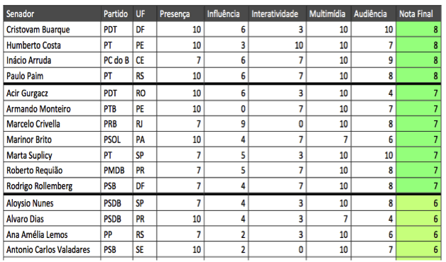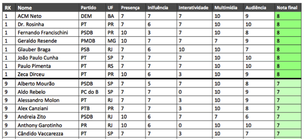 Há, é claro, alguns congressistas que se destacam e são extremamente ativos no mundo virtual. O estudo da Medialogue tem uma tabela na qual atribui uma pontuação para cada político.