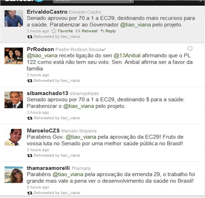 O governador do Acre, Tião Viana (PT), tem recebido, nesta quinta-feira (07) nas redes sociais Twitter e Facebook, o reconhecimento por parte da sociedade pela aprovação da emenda constitucional 29 – que aumenta repasse de verbas a serem investidas na saúde pública de todo o País. Tião Viana, quando senador pelo Acre, apresentou o projeto aprovado ontem pelo Congresso Nacional.
