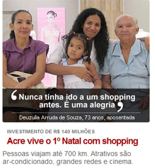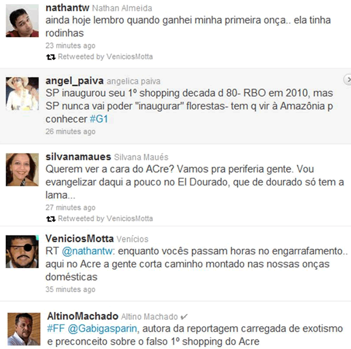 Uma longa reportagem do G1, portal de notícias da Rede Globo, publicada nesta sexta-feira (09) sobre o primeiro mês de funcionamento do Via Verde Shopping tem gerado a indignação de alguns acrianos com perfis nas redes sociais Twitter e Facebbok. A maioria aponta o conteúdo como preconceituoso. “Ridícula essa reportagem do G1, parece que o povo de fora tem mania de sensacionalizar tudo o que acontece no Acre”, disse Priscilla Oliveira.