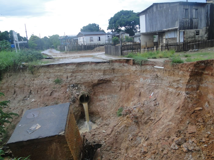 A cratera no meio da rua Beira Rio, uma das principais do bairro Cidade Nova, chama atenção pelo seu tamanho. O pior é que mais famílias estão em risco.
