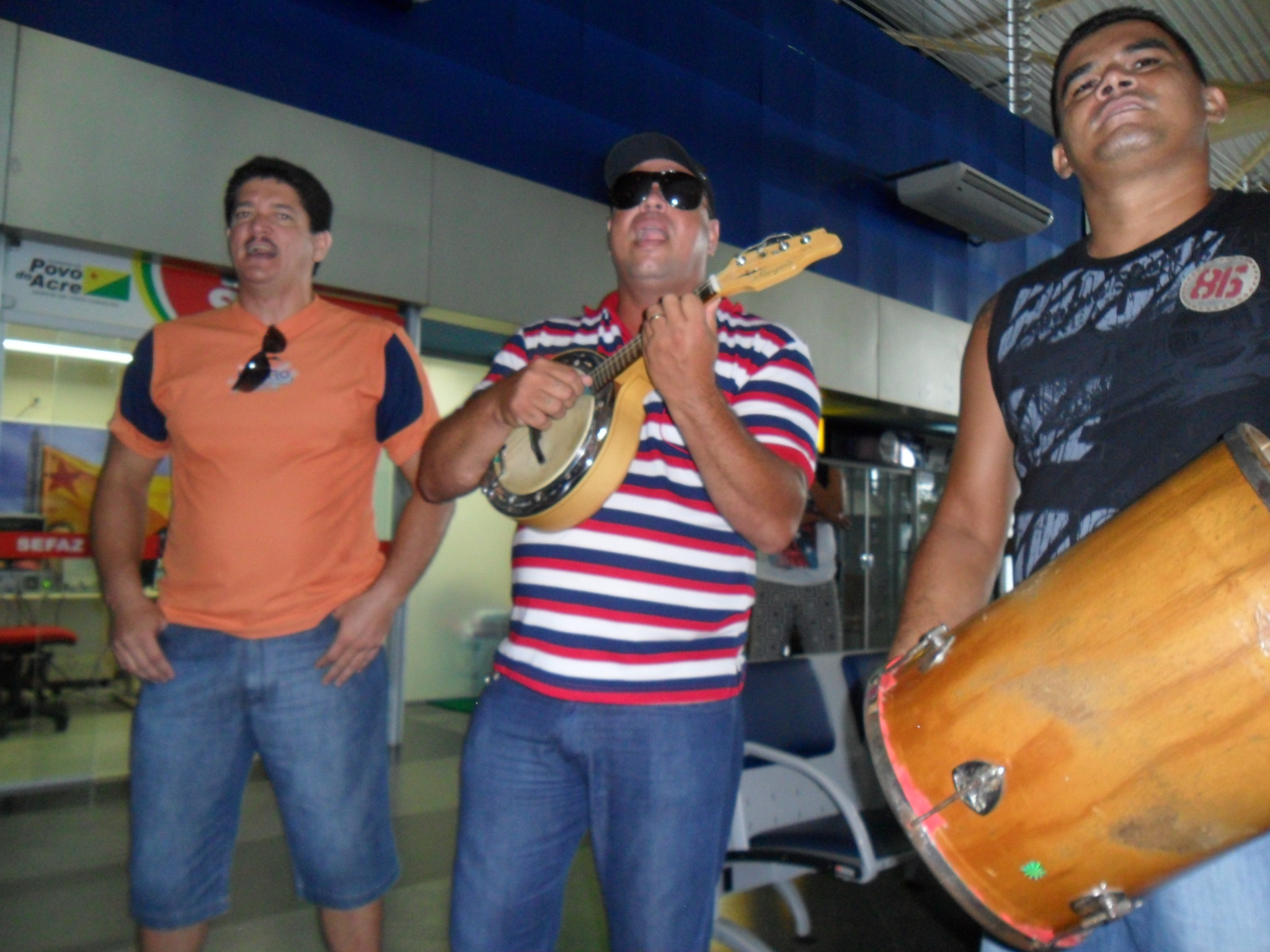 “Eles não esperavam por isso”. A frase foi do produtor Anderson do grupo Fundo de Quintal ao se deparar com o grupo Nosso Samba no aeroporto de Rio Branco no inicio da tarde desta sábado. Os pagodeiros de Rio Branco foram recepcionar os sambistas cariocas e contagiaram o público. Enquanto o grupo desembaraça, os pagodeiros cantavam os grandes sucessos do Fundo de Quintal, o que foi suficiente para fazer a galera cair no samba. Quando perceberam a homenagem os sambistas logo acenaram para o grupo e até ensaiaram alguns passos enquanto aguardavam a bagagem.