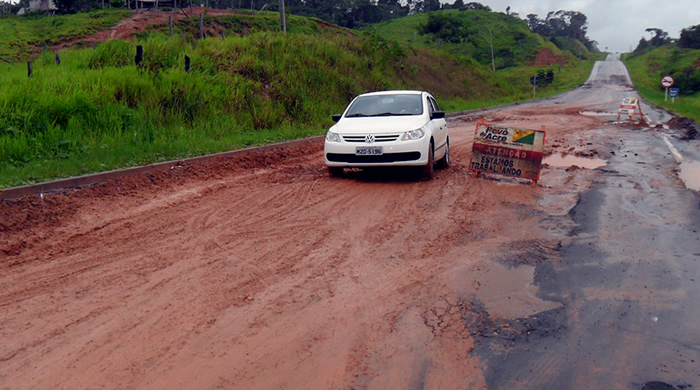 5 km á frente novo atoleiro se formou na pista que onde o asfalto perdeu lugar para a lama. Além dos atoleiros os inúmeros buracos deixados pela empresa responsável pelo trecho tiram a tranqüilidade dos motoristas. Os operários retiraram a camada asfáltica para realizar o tapa buracos, mas foram embora deixando o asfalto “aberto”.