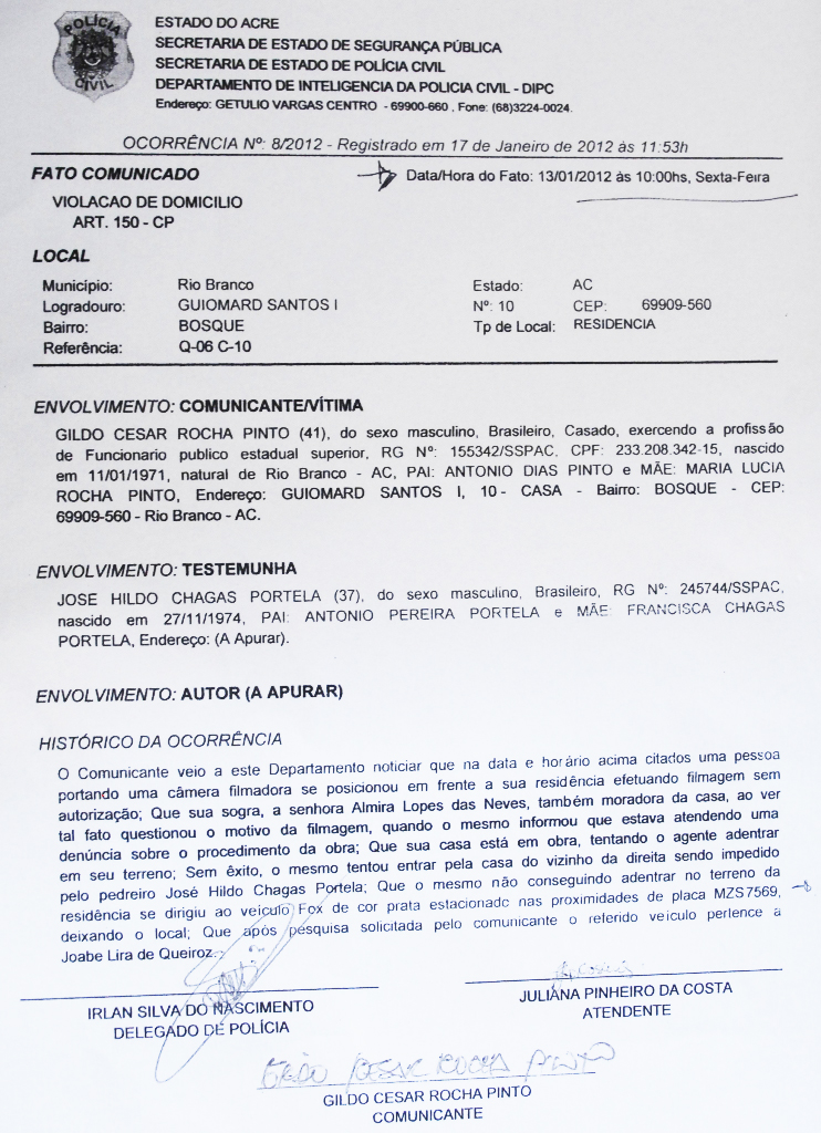 Segundo depoimentos da sogra de Gildo César, Almira Lopes Neves, 67, um rapaz em posse de uma máquina filmadora afirmava está a serviço da TV Rio Branco, afiliada no SBT, e estaria no local para averiguar uma denúncia sobre o aterro que estava sendo realizado na obra de reforma da casa do diretor do Depasa.