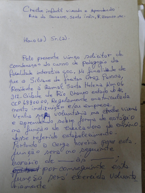 Quando nossa reportagem chegou à Creche Vivendo e Aprendendo, o responsável pelo local acabara de escrever um ofício manuscrito pedindo uma parceria com uma faculdade particular para conseguir pedagoga.