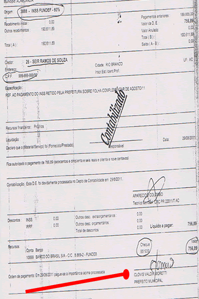 Dando continuidade a queda de braço entre o Sindicato dos Professores Lincenciados e a Prefeitura de Acrelândia, ontem (20), a presidente do sindicato, Socorro Lima, enviou cópias de documentos que foram protocolados no Ministério Público, comprovando que os pagamentos considerados indevidos com recursos do Fundo de Manutenção e Desenvolvimento da Educação Básica e de Valorização dos Profissionais da Educação (Fundeb), foram feitos mesmo no período do prefeito Clovis Moretti.