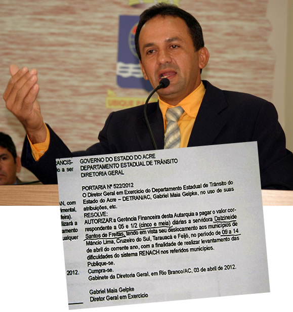 As portarias 522 e 548/2012 comprovam a duplicidade nos pagamentos de diárias. No mesmo dia, Dalzineide estava nos municípios de Mâncio Lima, Cruzeiro do Sul, Tarauacá, Feijó e Sena Madureira. A servidora ganhou cinco diárias e meia pelo período. Desde que foi nomeada, dia 02 de março deste ano, recebeu mais de dez diárias.