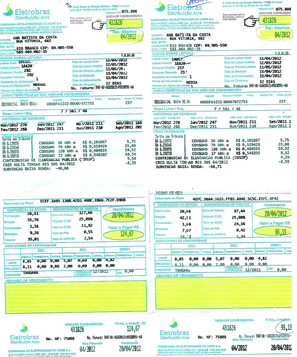 Na semana passada a consumidora Ana Batista da Costa, que reside á Rua Vitória, 682 no conjunto Tangará, ficou sem entender nada quando recebeu em casa duas contas de energia referentes ao mês de abril, da mesma unidade consumidora, porém com preços diferentes. Na primeira leitura, o relógio indicou um consumo de 292 kwh, que gerou uma conta de R$ 124,67. A leitura foi realizada no dia 13 de abril com vencimento previsto para o dia 20 do mesmo mês.