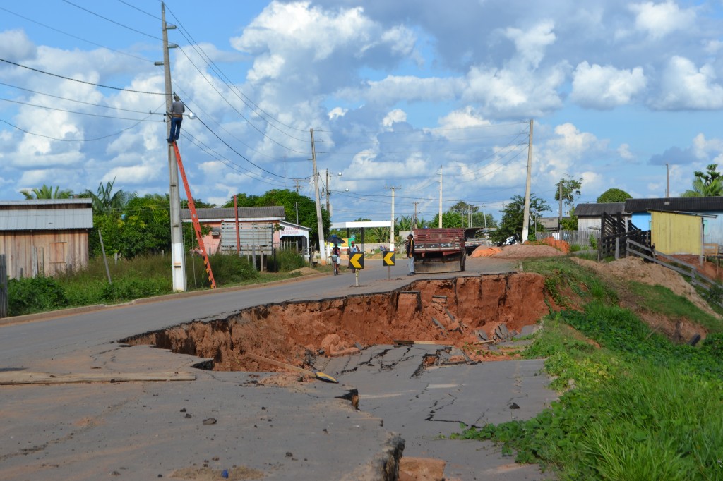 Uma enorme cratera virou cartão postal da cidade de Manoel Urbano, na zona central do estado do Acre. Localizada na entrada do município, o buraco engoliu mais de 60% da única estrada que permite acesso até a BR 364. Os moradores que moram próximo ao local têm medo de serem engolidos pela destruição. Pior, o aniversário da cidade é dia 14 de maio.