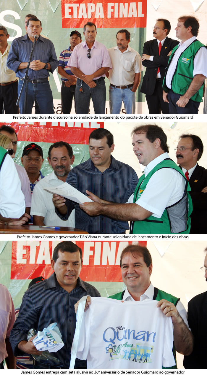 Na manhã desta quarta feira, 9, o governador Sebastião Viana (PT-AC), na companhia do prefeito James Gomes (PSDB) e na presença de autoridades e populares lançaram o programa Ruas do Povo no município de Senador Guiomard, cidade distante da capital acreana Rio Branco 24 km, mais conhecida como Quinari. A solenidade ocorreu no bairro Chico Paulo. Tião Viana e James Gomes anunciaram o inicio das obras de pavimentação de 95 ruas do município com tijolos e asfalto, totalizando cerca de 22 km de vias, atendendo todos os bairros. Somente na pavimentação de vias serão investidos mais de R$ 14 milhões e geração de mais de 300 postos de trabalhos.
