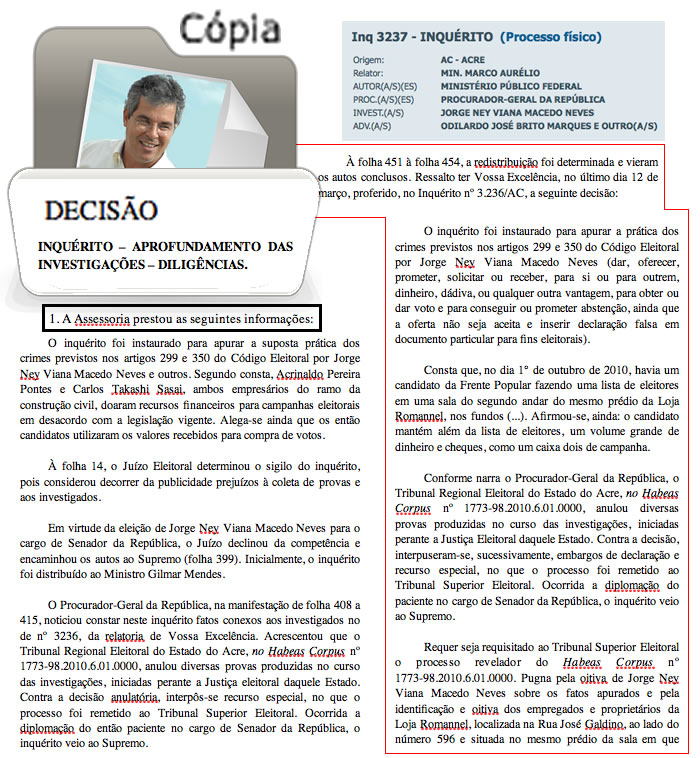 À folha 14, o Juízo Eleitoral determinou o sigilo do inquérito, pois considerou decorrer da publicidade prejuízos à coleta de provas e aos investigados. Em virtude da eleição de Jorge Ney Viana Macedo Neves para o cargo de Senador da República, o Juízo declinou da competência e encaminhou os autos ao Supremo (folha 399). Inicialmente, o inquérito foi distribuído ao Ministro Gilmar Mendes. O ministro pleiteou a expedição de ofício ao Tribunal Regional eleitoral para que encaminhe cópia dos autos; da prestação de contas das eleições de 2010 referente ao candidato Jorge Ney Viana Macedo Neves e ainda, cópias do mandado de segurança n° 1169-40.2010.6.01.0000 sobre diligências de busca e apreensão realizadas e Habeas Corpus sobre acesso aos autos do presente inquérito.