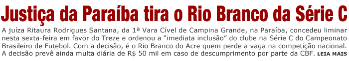 A juíza Ritaura Rodrigues Santana, da 1ª Vara Cível de Campina Grande, na Paraíba, concedeu liminar nesta sexta-feira em favor do Treze e ordenou a “imediata inclusão” do clube na Série C do Campeonato Brasileiro de Futebol. Com a decisão, é o Rio Branco do Acre quem perde a vaga na competição nacional. A decisão prevê ainda multa diária de R$ 50 mil em caso de descumprimento por parte da CBF.