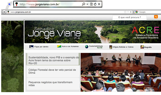 Viana, que aderiu às redes sociais da internet nesta terça-feira, adotou como ícone ao lado do endereço de seu site oficial, o www.jorgeviana.com.br o desenho da árvore com as cores verde e amarelo.