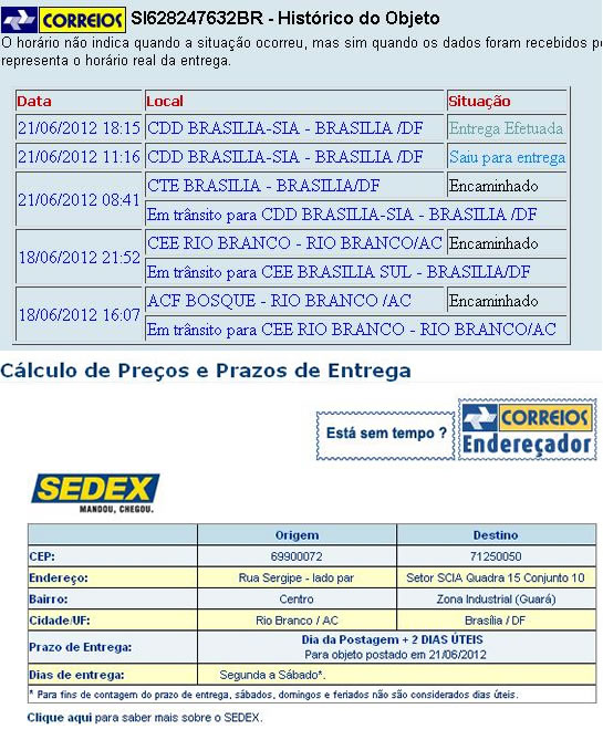 A reportagem fez um teste através de envio de Sedex de Rio Branco (AC), na segunda-feira (18), para Brasília (DF), e o resultado é que a encomenda chegou ao seu destino somente no quarto dia, quinta-feira (21). No site, a companhia promete a entrega para o terceiro dia.