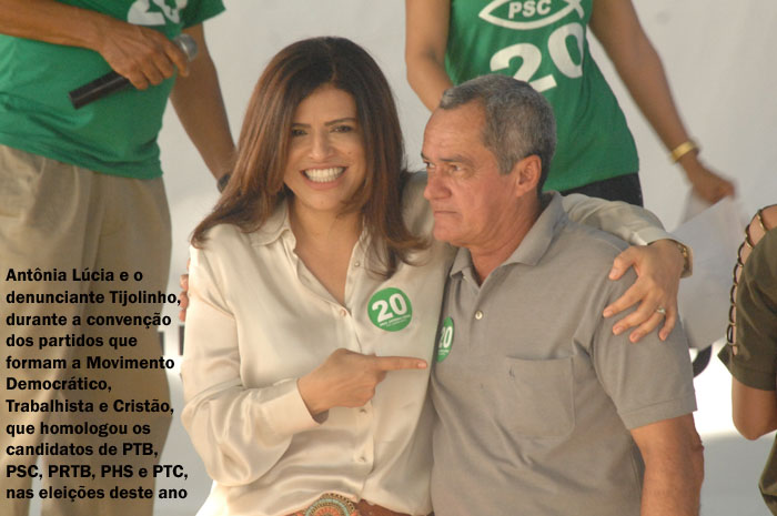 Antônia Lúcia acusa Tijolinho de fraudar o sistema do PRTB para reinserir seu nome, como presidente da executiva municipal do partido. “Tijolinho foi destituído. A presidência do PRTB nomeou Valdir França, mas o ex-presidente tem a senha do sistema e reinseriu seu nome”.