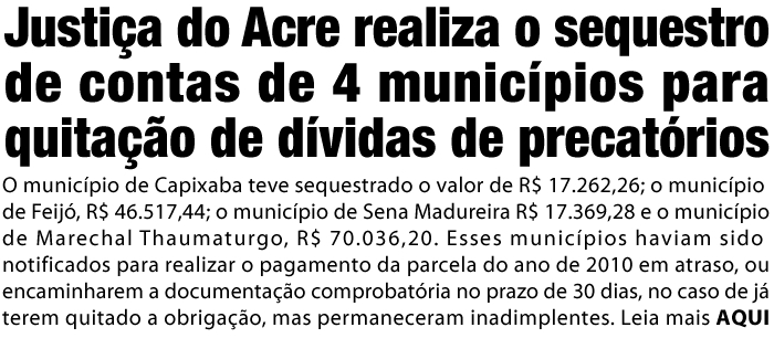 O Tribunal de Justiça do Acre, por meio do Núcleo de Processamento e Gestão de Precatórios, realizou no Bacen Jud (sistema de envio de ordens judiciais ao Sistema Financeiro Nacional via Internet) o sequestro em conta dos valores referentes à parcela em atraso do ano de 2010, dos recursos necessários ao pagamento dos precatórios dos municípios de Capixaba, Feijó, Marechal Thaumaturgo e Sena Madureira. A decisão do TJAC está publicada na edição de hoje (19) do Diário da Justiça Eletrônico (DJe nº 4.720, fls. 4 e 5).