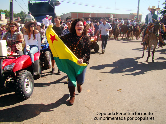 Sem fazer a mínima questão de aparecer ao lado do governador Sebastião Viana, de quem ainda guarda mágoas, por não ser escolhida como candidata à prefeita de Rio Branco, a deputada federal Perpétua Almeida, a pé, sob o sol escaldante deste sábado, mas sorridente, carregando a bandeira do Acre, (PC do B) foi a cavalgada.