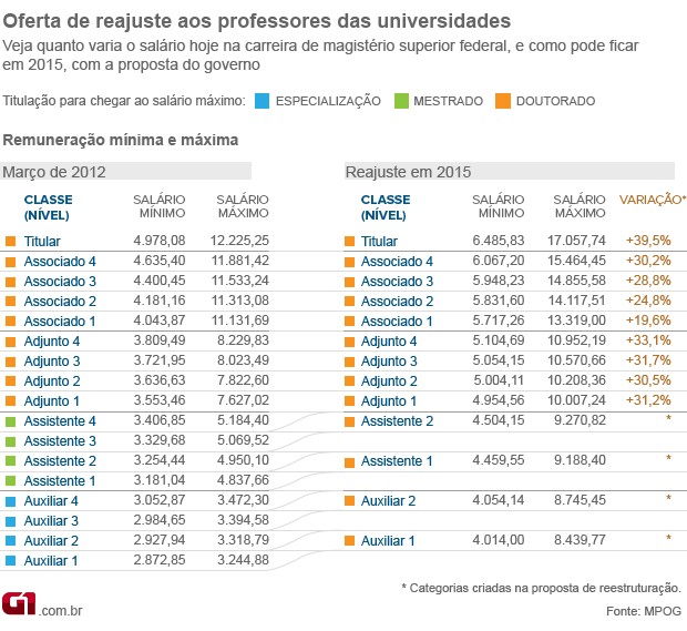 De acordo com o documento do governo, a estrutura das carreiras Magistério Superior Federal e Ensino Básico, Técnico e Tecnológico será enxugada em comparação com a realidade atual dos professores. O cargo de professor titular, que antes era separado, foi incluído como nível mais alto, em uma estrutura que, em ambas as categorias, possui 13 níveis de cinco classes (veja abaixo).