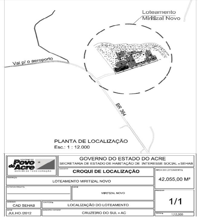 O governo do Acre acaba de regularizar um novo loteamento na cidade de Cruzeiro do Sul. Trata-se de uma área de terra mais de 42m² localizado próximo a margem direita da Br 364, na região do Aeroporto, sentido Bairro-Centro, ao lado do Residencial Paraíso. A área de terra receberá o nome de “Loteamento Miritizal Novo” e será distribuído da seguinte forma: Arruamento 16.468,05 m², Área Verde 4.015,45 m², Área de lotes 21.571,50, com um total de 96 lotes. O edital de loteamento foi publicado nesta quarta-feira, 25, no Diário Oficial.