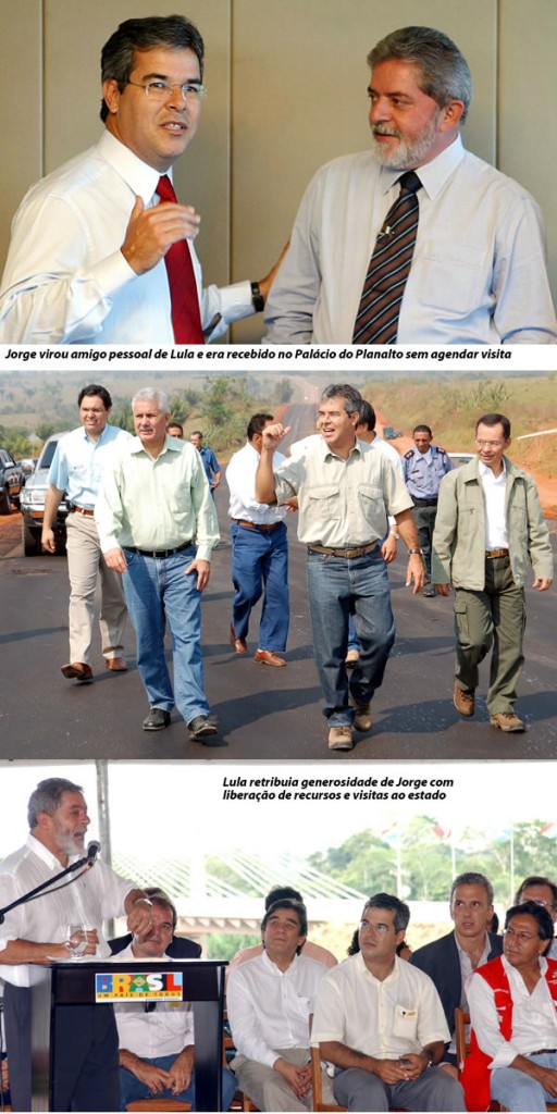 Apesar de não haver tantas evidencias criminais, Jorge Viana agiu praticamente como receptador do mensalão. Protegeu sua sigla partidária e seus comparsas de partido em troca de apoio financeiro federal, político e a presença do popular ex-presidente Lula em visitas constantes ao Acre, inclusive para inaugurações de obras públicas e fizeram poses de braços dados para a imprensa, e declarações afetivas. Jorge usou sua proximidade e prestígio com o presidente Lula para atrair dinheiro internacional e investidores, muitos deles desistiram do Acre e abandonaram empreendimentos.