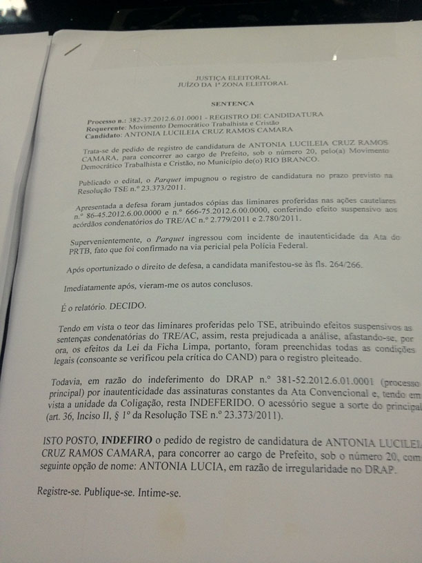 Denunciei as manobras da juíza da 1a. Zona Eleitoral do Estado do Acre para me tirar da disputa ao cargo de prefeita da capital.