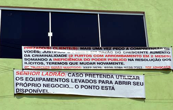 O empresário dono do empreendimento, que não foi localizado pela reportagem, usou duas faixas para protestar ironicamente contra duas investidas de ladrões que invadiram uma das lojas e levaram dezenas de ferramentas.