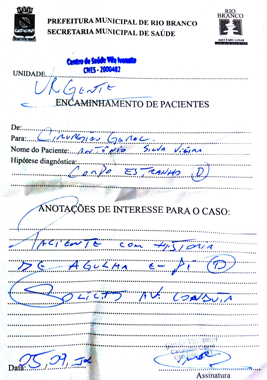 Ainda no domingo ela foi encaminhada para o Hospital de Urgências e Emergência de Rio Branco [HUERB]. Atendida pelo Dr. Fernando J. Amorim, a paciente fez outro Raio-x e se submeteu novamente a uma série de anestesias e tentativas de retirada da agulha.