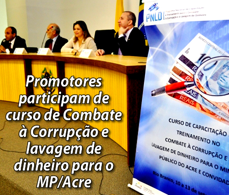 Com o objetivo de capacitar seus integrantes no combate ao crime organizado, o Ministério Público do Estado do Acre (MP/AC) trouxe à Rio Branco o curso de Capacitação e Treinamento no Combate à Corrupção e à Lavagem de Dinheiro. O curso é uma iniciativa do Departamento de Recuperação de Ativos e Cooperação Jurídica Internacional (DRI), do Ministério da Justiça, e ocorre no auditório da Justiça Federal entre os dias 10 e 14 próximos.