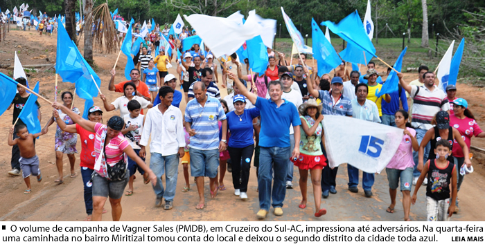 Acompanhado de sua esposa, Deputada Antônia Sales, de seu Vice Mazinho e de candidatos a vereador da Coligação Força e Trabalho, o candidato a prefeito Vagner Sales fez campanha nesta quarta-feira, 12, no Bairro Miritizal. Conhecido como Segundo Distrito, o Bairro Miritizal. Um dos mais tradicional e populosos bairros de Cruzeiro do Sul, o Miritizal recebeu Vagner Sales de braços abertos.