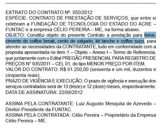 Dessa vez a Funtac (Fundação de Tecnologia do Acre) assinou contrato com a empresa Célio Pereira-ME, no valor de R$ 61 mil, para fornecimento de coffee breack, coffe suco, kit lanche e cento de salgados.