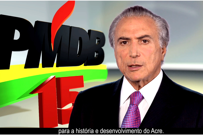 “Nós do PMDB temos o melhor nome para você escolher como prefeito. Pode estar certo, apoiarei o seu prefeito do PMDB em Brasília para mudar a vida da sua cidade e continuar trabalhando por um Brasil melhor. Por isso, para prefeito de Rio Branco vote no Fernando Melo. É a tradição do PMDB que já contribui imensamente para a história e o desenvolvimento do Acre”, pede Michel Temer, que depois é sequenciado pelas aparições do deputado federal Flaviano Melo (PMDB) e do senador Sérgio Petecão (PSD), que também pedem voto para Fernando Melo, na mesma propaganda.