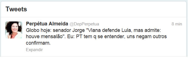Diz a parlamentar em seu comentário: “Globo hoje: senador Jorge “Viana defende Lula, mas admite: houve mensalão”. //Eu: PT tem q se entender, uns negam outros confirmam”.