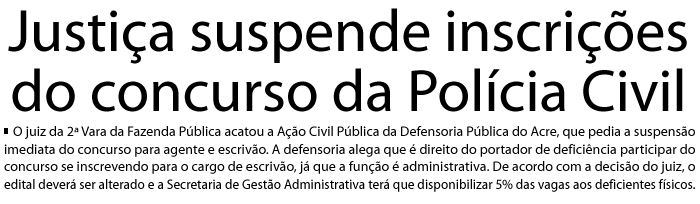 O juiz da 2ª Vara da Fazenda Pública acatou a Ação Civil Pública da Defensoria Pública do Acre, que pedia a suspensão imediata do concurso para agente e escrivão.