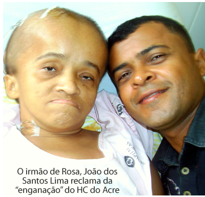 No leito 128 do Hospital das Clínicas, em Rio Branco, a paciente Rosa dos Santos Lima, 38 anos, vive dias difíceis. Segundo a família, Rosa, com problemas neurológicos, já foi submetida a seis intervenções cirúrgicas para aliviar a pressão em sua cabeça. “Não adiantaram. Agora os médicos dizem ser necessária a instalação de um equipamento denominado de Válvula de CODMANN”, conta João dos Santos Lima.