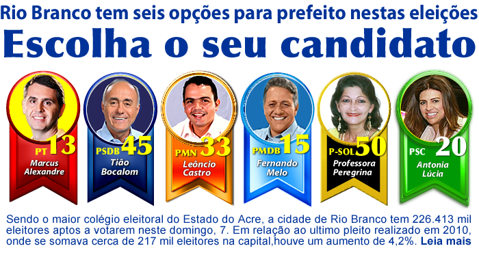 Com governo e prefeitura na mão, o PT do Acre tenta brecar uma reação dos candidatos da oposição que disputam o pleito. Tião Bocalom (PSDB), Fernando Melo (PMDB), Antônia Lúcia (PSDC), Leôncio Castro (PMN) e Maria Peregrina do PSOL são os outros postulantes ao cargo mais cobiçado nestas eleições na capital.